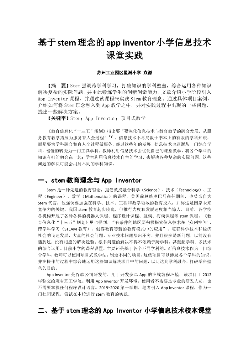 基于stem理念的app inventor小学信息技术课堂实践 作者: 来源: 发布时间:2022-12-02 点击数: 次 作者:袁源期刊信息:《时代教育:下旬》杂志 2021 年 8 期封面:目录:内容: 【字体:小 大】 【打印文章】