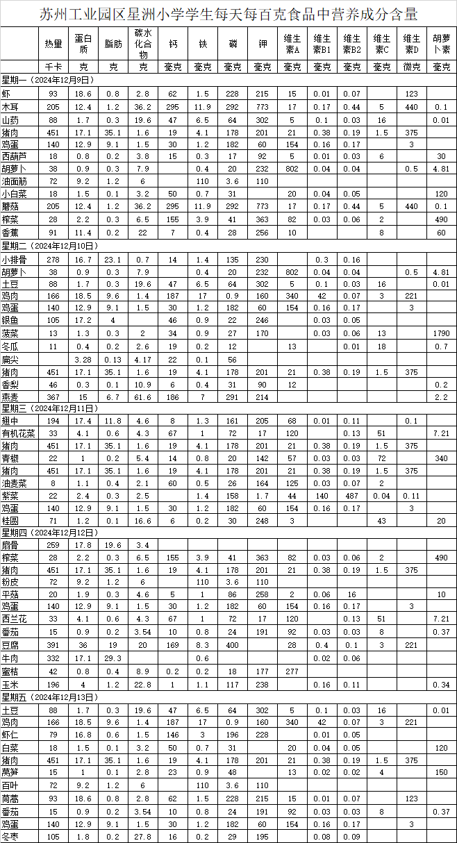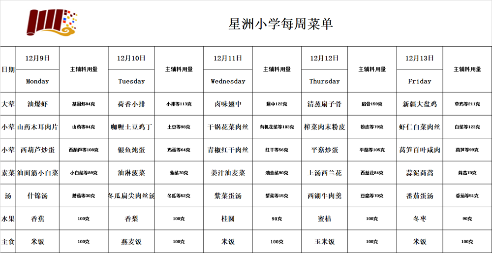 每周菜单(2024.12.9-2024.12.13) 作者:陈琴 来源: 发布时间:2024-12-06 点击数: 次 每周菜单(2024.12.9-2024.12.13) 【字体:小 大】 【打印文章】