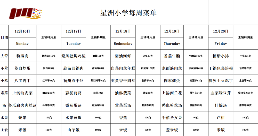 每周菜单(2024.12.16-2024.12.20) 作者:陈琴 来源: 发布时间:2024-12-13 点击数: 次 每周菜单(2024.12.16-2024.12.20) 【字体:小 大】 【打印文章】