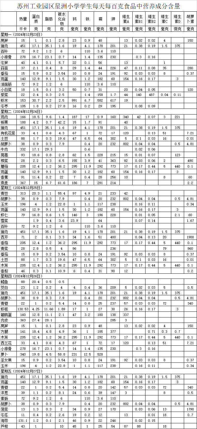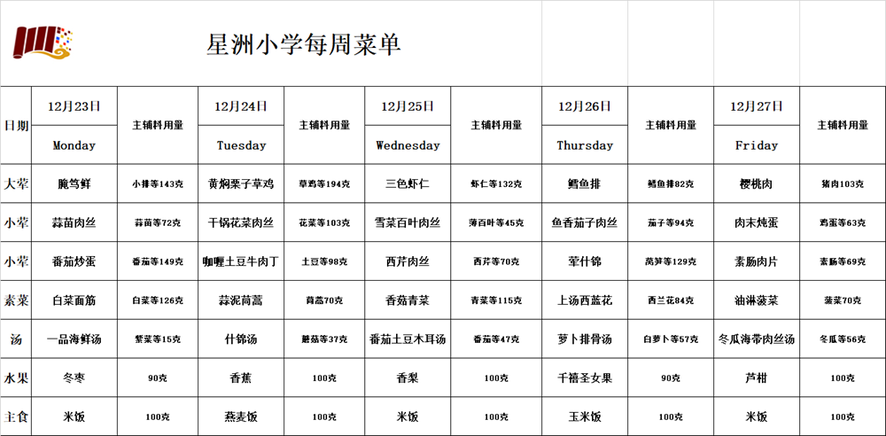 每周菜单(2024.12.23-2024.12.27) 作者:陈琴 来源: 发布时间:2024-12-20 点击数: 次 每周菜单(2024.12.23-2024.12.27) 【字体:小 大】 【打印文章】