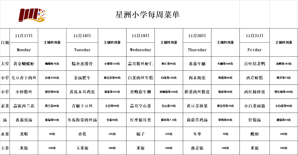 每周菜单(2025.11.17-2025.11.21) 作者:陈琴 来源: 发布时间:2025-11-14 点击数: 次 每周菜单(2025.11.17-2025.11.21) 【字体:小 大】 【打印文章】